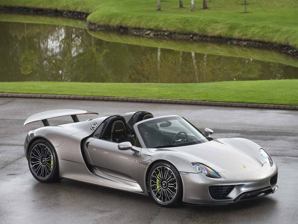 La porsche 918 spider est sorti entre 2013 et 2015, elle proviens d'Allemagne La Porsche 918 a été élue « meilleure voiture du monde » aux Joiris Car Awards 2013. L'avant de la 918 est doté de deux grandes prises d'air qui lui donnent son aspect très sportif et résolu. Le capot avant, bien qu'il donne l'impression d'être plus fin, englobe en réalité les ailes du véhicule et va jusqu'aux passages de roues. Les optiques avant rappellent beaucoup par leur forme celles de la Carrera GT Un trait reconnaissable du design de la 918, est l'alternance de courbes convexes et concaves, et l'omniprésence de bords saillants créant un effet de « profondeur » dans la carrosserie. C'est le cas au niveau des larges entrées d'air latérales, qui continuent vers les bossages du dessus. Les feux arrière à LED profitent également de façon marquée de cette conception « tridimensionnelle ». La 918 dispose de jantes spécifiques bicolores, de 20 pouces à l'avant et 21 pouces à l'arrière. D'après le constructeur, le contraste entre les parties peintes en noir et les bords chromés en surface crée également un effet tridimensionnel. Des jantes allégées en magnésium provenant de la RS Spyder (-14,9 kg) sont disponibles en option, pour de meilleures performances. Elles sont par ailleurs incluses dans le Pack Weissach.